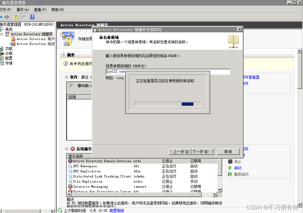 7、设置域的名称hjw123.com,稍微等待(此域名非彼域名,重要的一点不能检测到有相同的)
