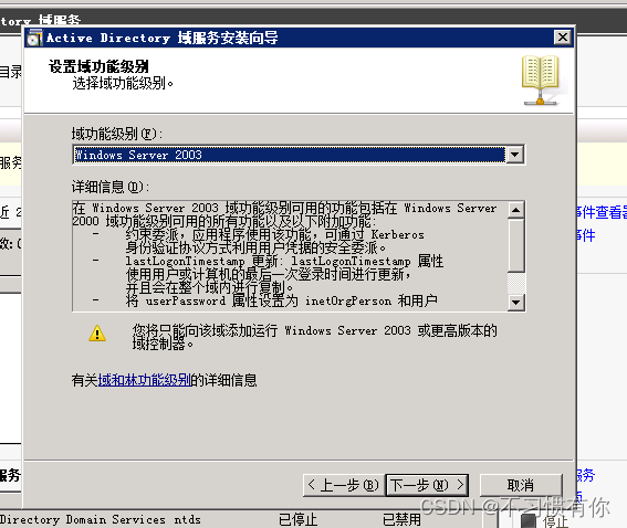 8、 选择windows Sever 2003级别的域,选择2003,因为域有向下兼容性,点击下一步