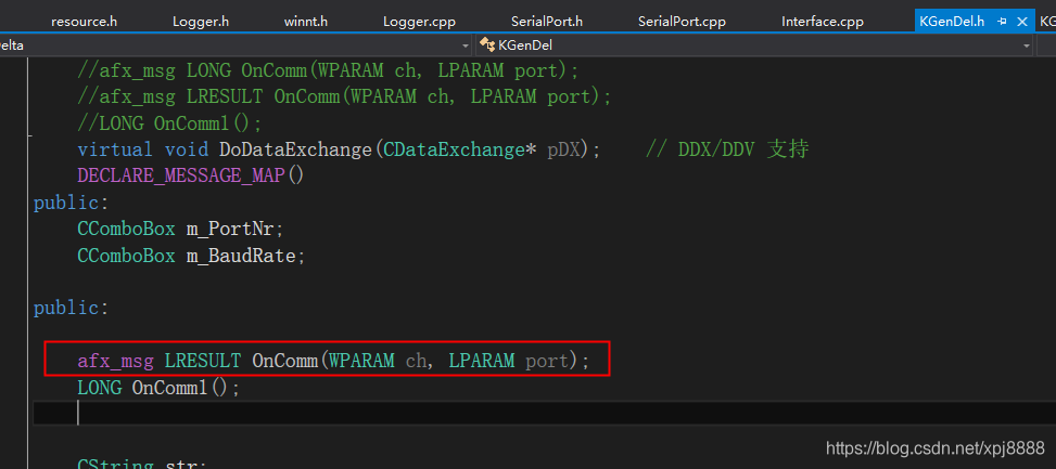 ON_MESSAGE(WM_COMM_RXCHAR, &KGenDel::OnComm)——通过WM_COMM_RXCHAR与串口关联起来,一旦接收串口类的指令,则响应消息OnComm。事件上,OnComm是KGenDel.cpp的函数。