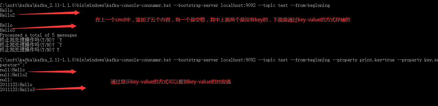 bin\windows\kafka-console-consumer.bat --bootstrap-server localhost:9092 --topic test --from-beginning --property print.key=true --property key.separator=":"大致的操作界面
