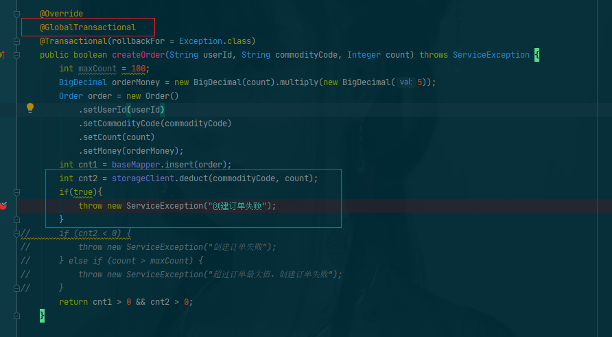- 当通过feign调用storage 减库存后,抛出异常,查看是否回滚。