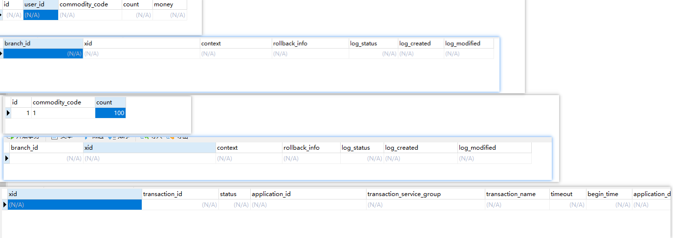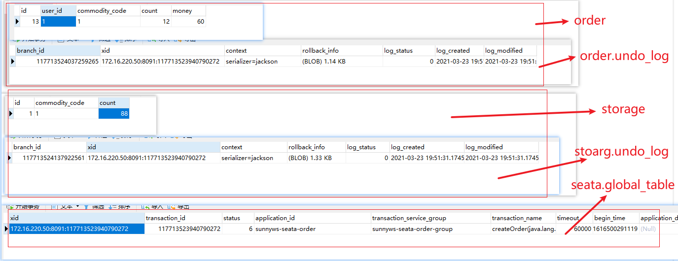 将本地@Transactional去除后,可以在异常抛出前看到订单和库存都已更新到数据库,并且客户端数据库undo_log表和seata服务端数据global_table表都生成了记录,xid也都相同。