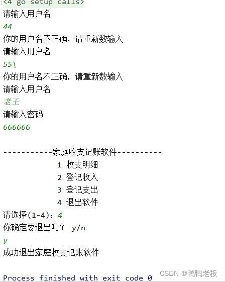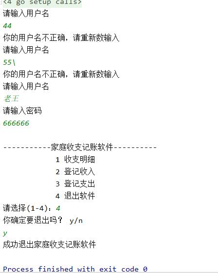 fmt.Println("成功退出家庭收支记账软件")