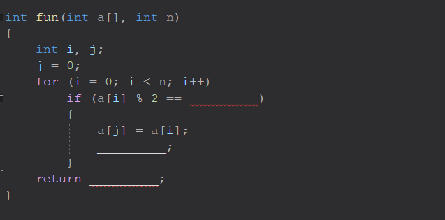 5、下列给定程序中,函数 fun 的功能是:把形参a所指数组中的奇数按原顺序依次存放到 a[0]、a[1]、a[2]… 中, 把偶数从数组中删除,奇数个数通过函数值返回。 例如,若a所指数组中的数据最初排列为: 9,1,4,2,3,6,5,8,7 ,删除偶数后,a所指数组中的数据为: 9,1,3,5,7 ,返回值为5。请在程序的下画线处填入正 确的内容并将下画线删除,使程序得出正确的结果( )