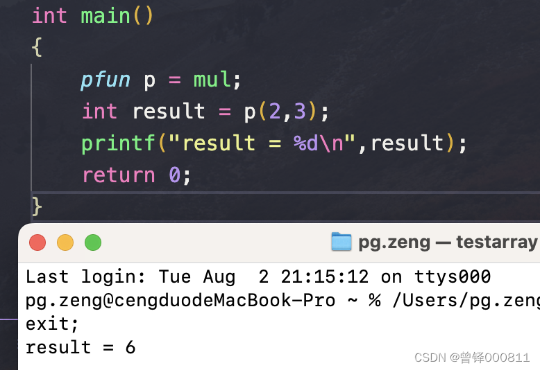 }在这里我对pfun进行了类型重命名,分别写了两个两数之和(add)和两数之积()的函数,在主函数中定义了p指针并使p指针指向了两数之积(mul)函数 ,我们来看看运行结果: