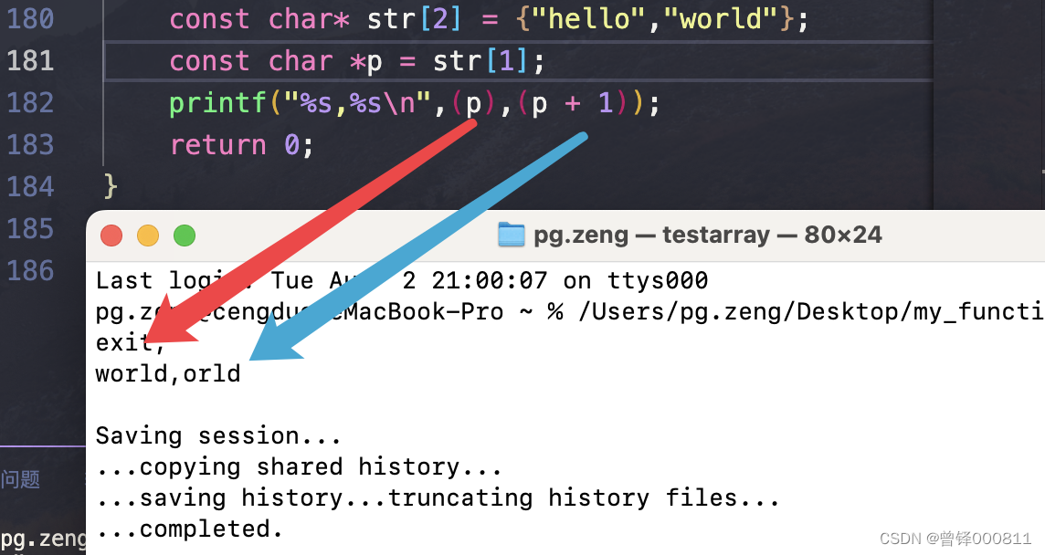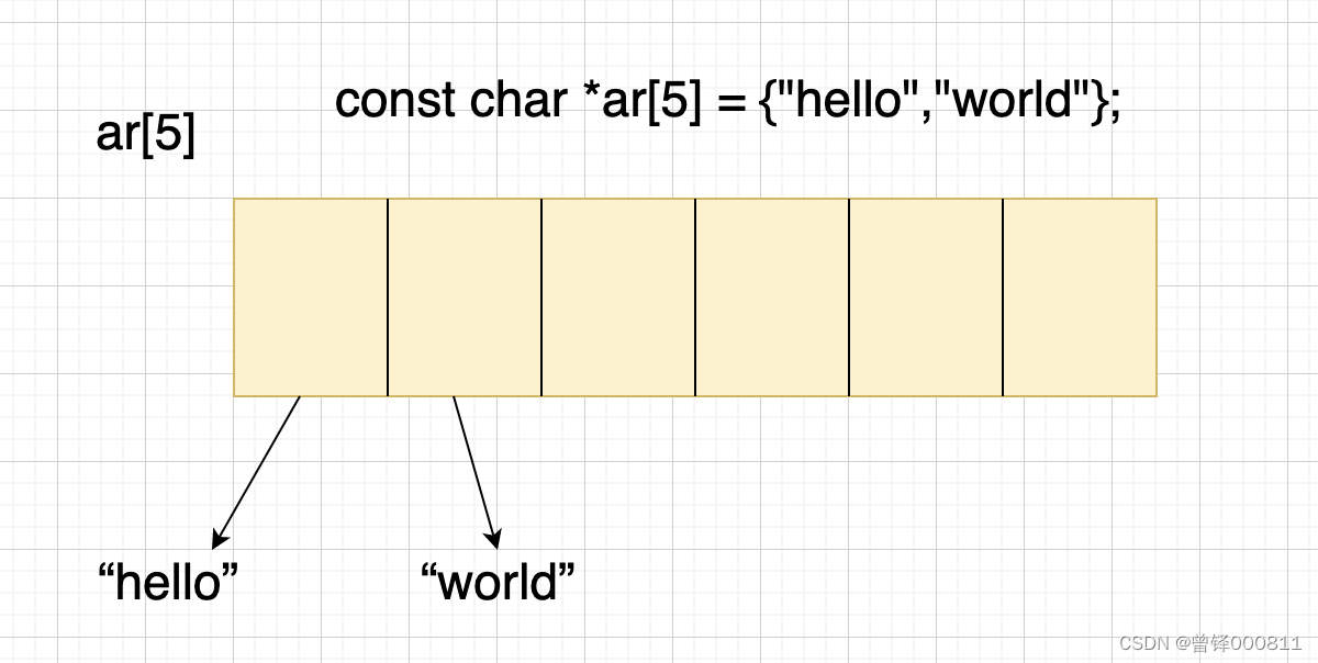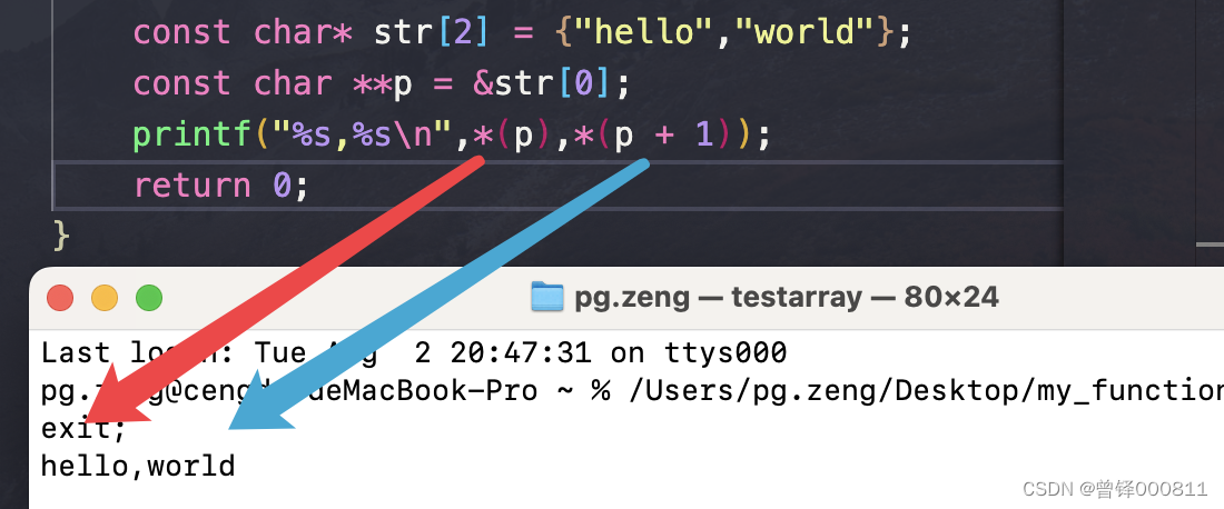 }在这段代码中,str是一个存放了两个指针变量的数组,两个指针变量分别指向hello和world的首地址,例如在这里我定义了一个二级指针p用于存放两个数组中存放的一级指针变量的地址,当我对二级指针p和(p + 1)分别进行解引用时,他们分别指向的是: