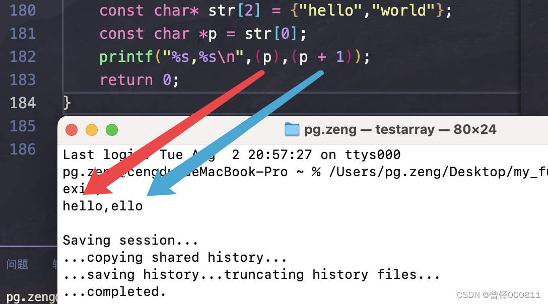 如图,分别打印出了hello和ello说明p指针发生了偏移,而且是一个字符!我们再来试试使用p指针指向第二个字符串的首地址然后打印:
