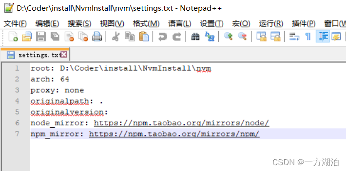 nvm npm_mirror [url] :设置npm镜像。https://github.com/npm/cli/archive/。如果不写url,则使用默认url。设置后可至安装目录settings.txt文件查看,也可直接在该文件操作。