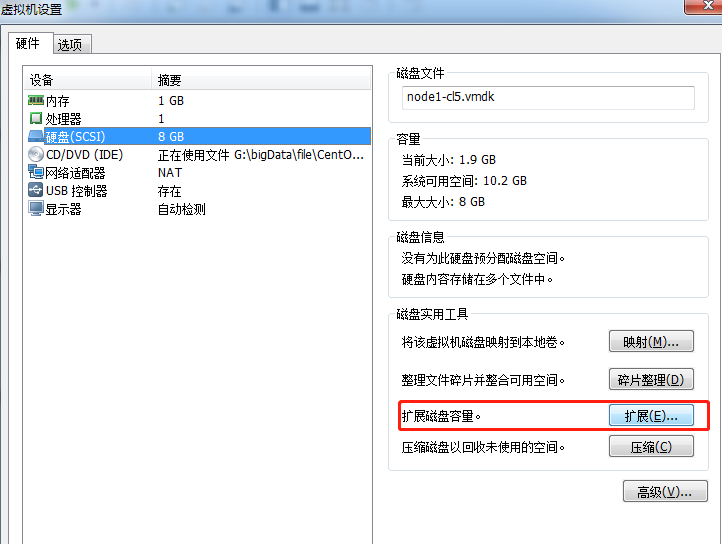 2、做如下设置:“ 虚拟机”--“虚拟机设置”--“磁盘”--“扩展”