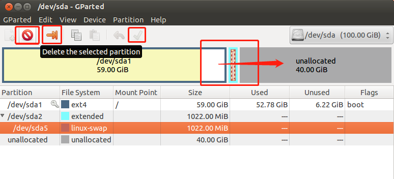 7、打开gparted工具,熟悉下,小白操作界面,一看就懂,不要轻易点“√”号,这个对号是确定操作。