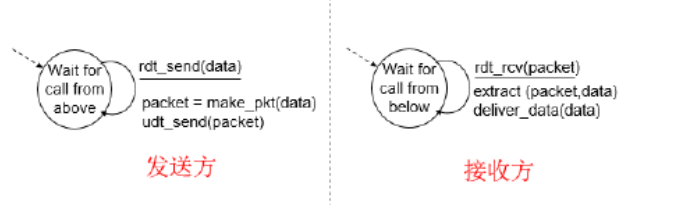 Rdt1.0:经完全可靠信道的可靠数据传输(底层信号非常可靠,无比特差错,无分组丢失)