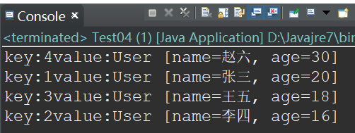 4.已知一个 HashMap<Integer,User>集合, User 有 name(String)和 age(int)属性。请写一个方法实现对HashMap 的排序功能,该方法接收 HashMap<Integer,User>为形参,返回类型为 HashMap<Integer,User>,要求对 HashMap 中的 User 的age 倒序进行排序。排序时 key=value 键值对不得拆散。