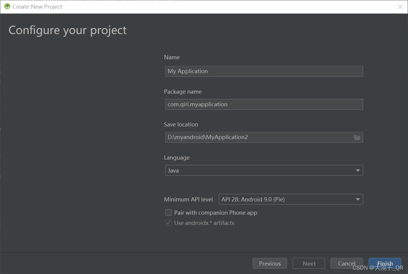 在这里输入自己的项目名称,还有选择API level,然后点击finish。