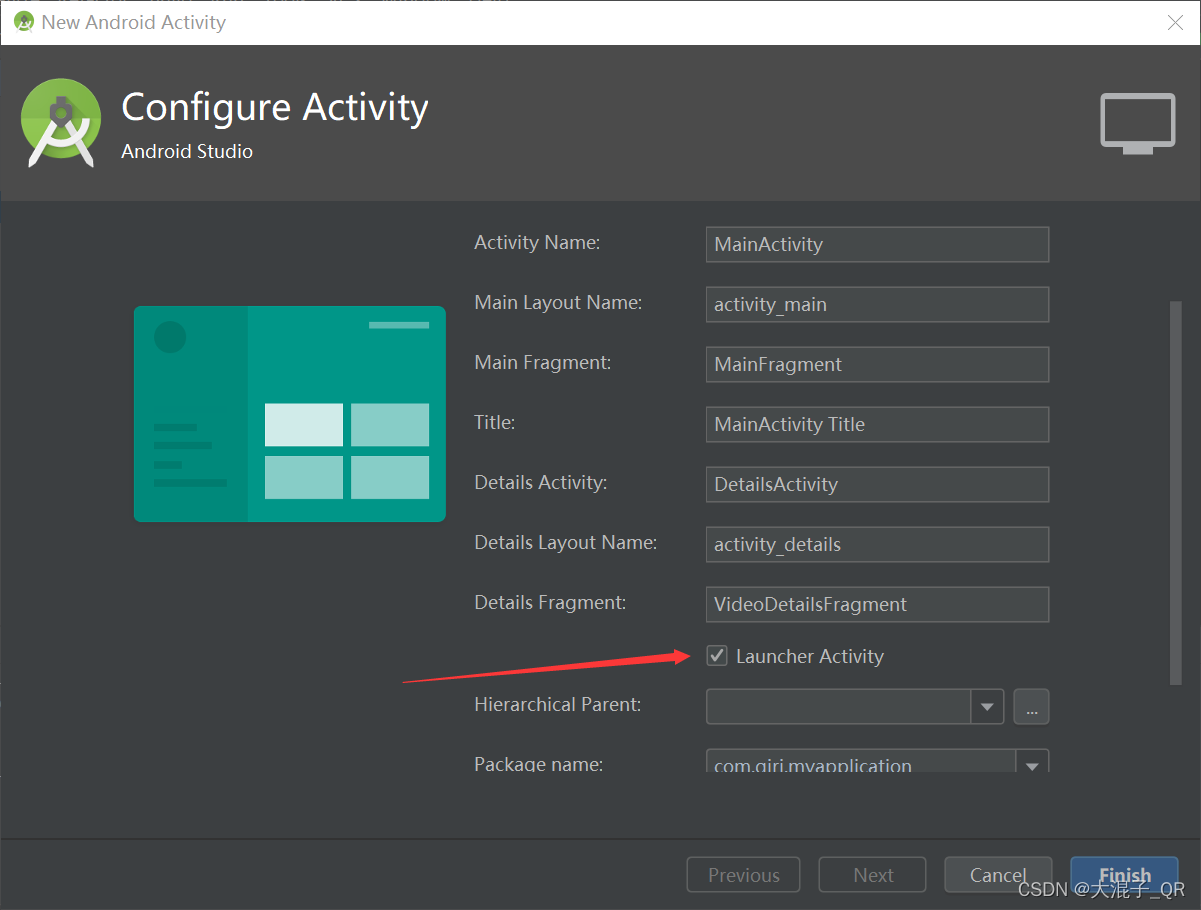 New→Activity→Android TV activity,勾择Launcher Activity。会自动命名为MainActivity。