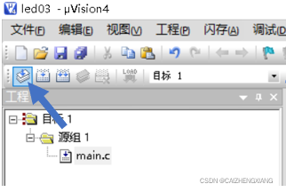因为你之前并未在main.c文件里编写任何程序,所以它现在是空的,我这里提供一段点亮一颗LED的程序,复制粘贴到你的main.c