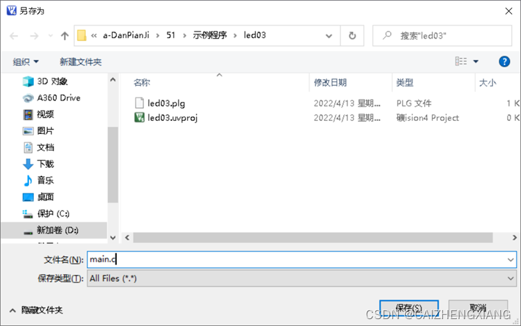 自动跳转到你工程的路径下,将文件名命名为 main.c,点击保存。