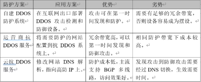 DDOS攻击防御的前提条件是有足够的冗余带宽,冗余带宽是指保障业务正常访问带宽后的剩余带宽。因此,除了少数大型企业有自建DDOS防护系统的必要,大多数情况一般是购买运营商抗DDOS服务,或者使用云抗DDOS防护服务。如表1,为不同DDOS攻击防护方案的应用场景和优缺点比较。