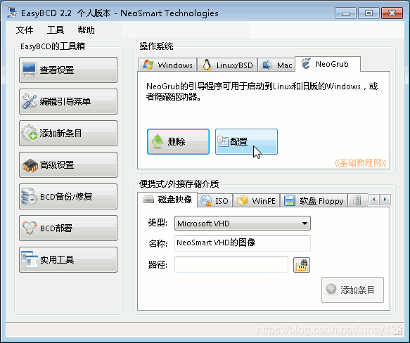 9)启动EasyBCD,点“添加一个项目-NeoGrub”,出来的面板下面点“删除”;