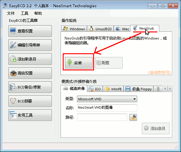 4)然后在右侧出来一个面板,点最右边的“NeoGrub”标签,再点它下边的“安装”按钮;