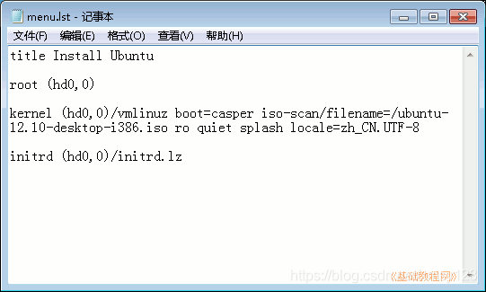 initrd (hd0,0)/initrd.lz如果系统中有100M保留分区,要将第二句改成(hd0,1),检查的方法请参阅 基础1课程,第三句里红色的文件名处,也要改成自己下载的镜像文件名;