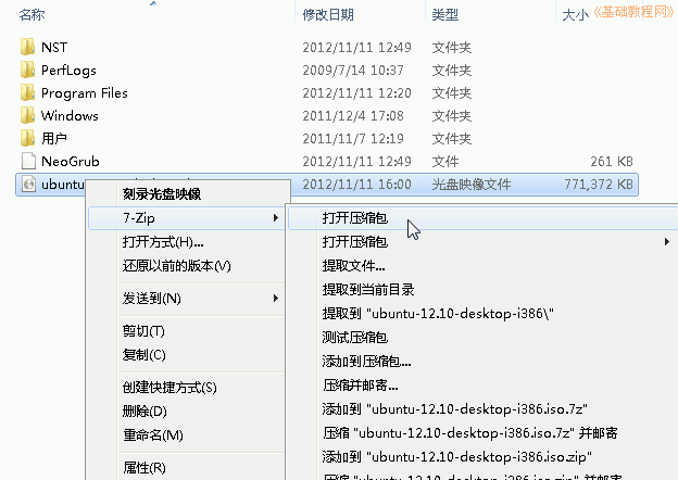 1)把下载的Ubuntu镜像文件复制到C:盘,用7-zip或WinRAR打开;