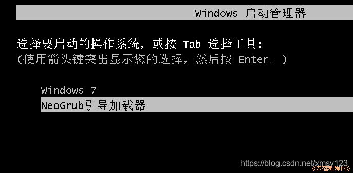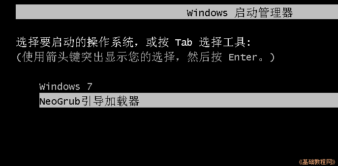 1)重新启动计算机,在出现启动菜单时,按下方向键选择“NeoGrub引导加载器”,按回车键进入;