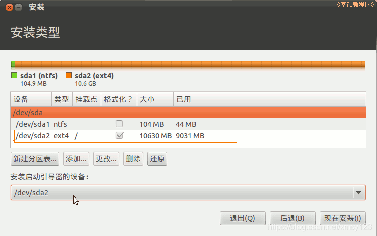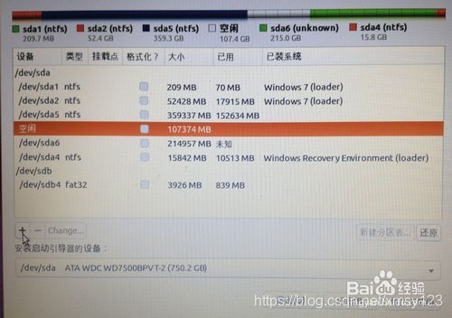 - 分区设置完毕后,下方还有一项“安装启动引导器的设备”,默认就如下图所示那样,也是网友们所说的sda,如果选择默认,则是ubuntu引导windows7,到时候卸载ubuntu时,可能会麻烦些,如果想用windows7引导ubuntu,请选择你/boot所在的盘符,之后还要在windows下安装引导类的软件,才能启动ubuntu,过程会复杂些。这一步骤请大家慎重选择,笔者选择的默认选项,以后产生什么问题,以后再说吧。
