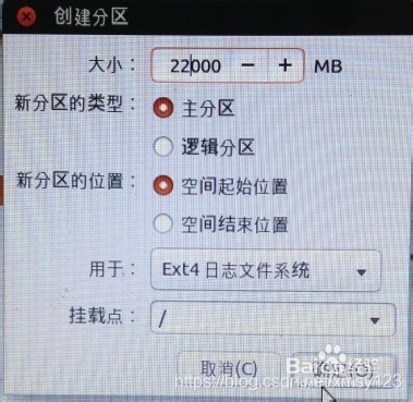 挂载点:/boot (网上有的说不需要设置这项,但双系统引导时需要,先不要去理解这些)