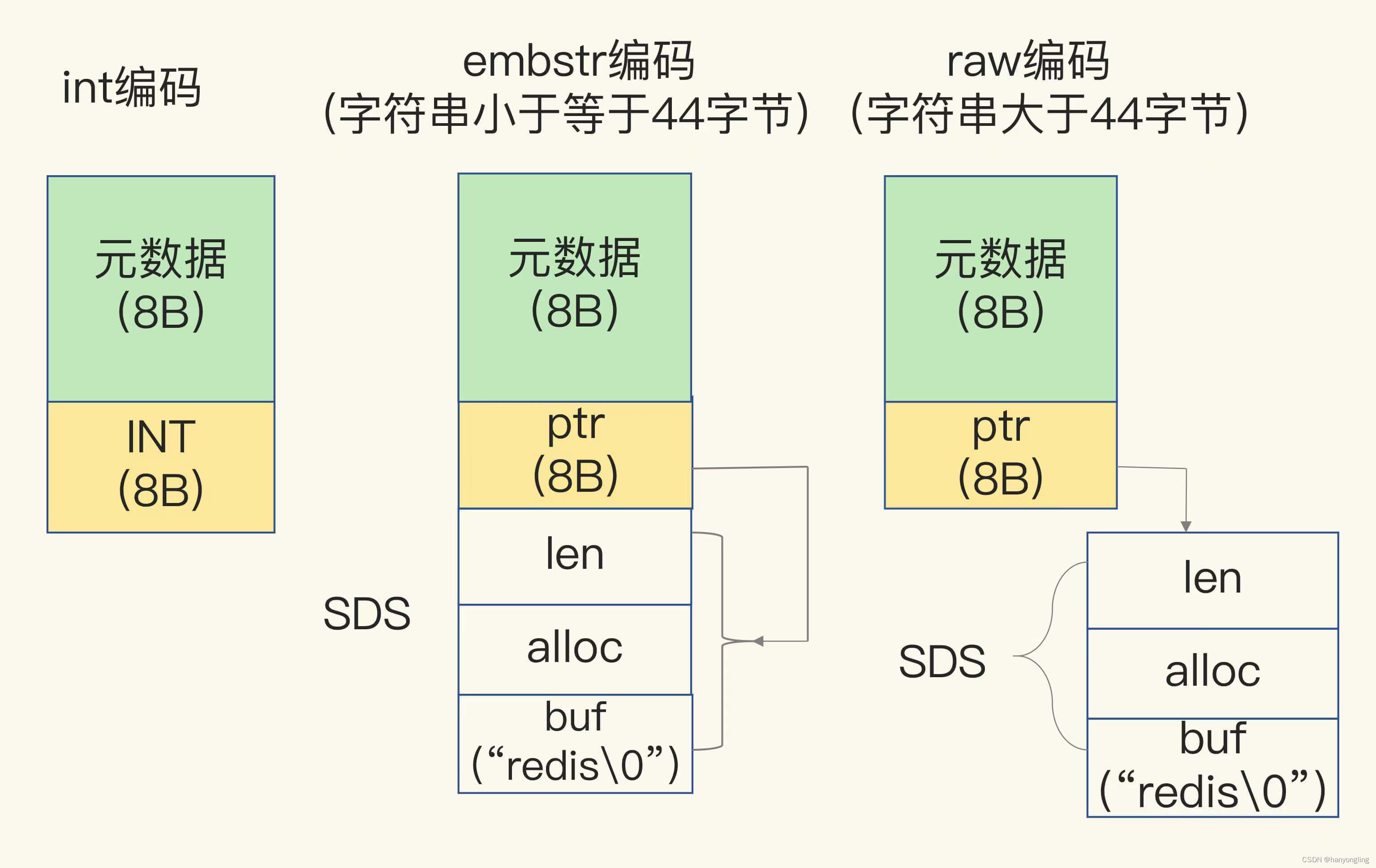 当字符串大于44字节时,Redis就不再把SDS和RedisObject分配在一起了,SDS会分配独立的空间,并用指针指向SDS结构,这种方式称为raw编码模式。