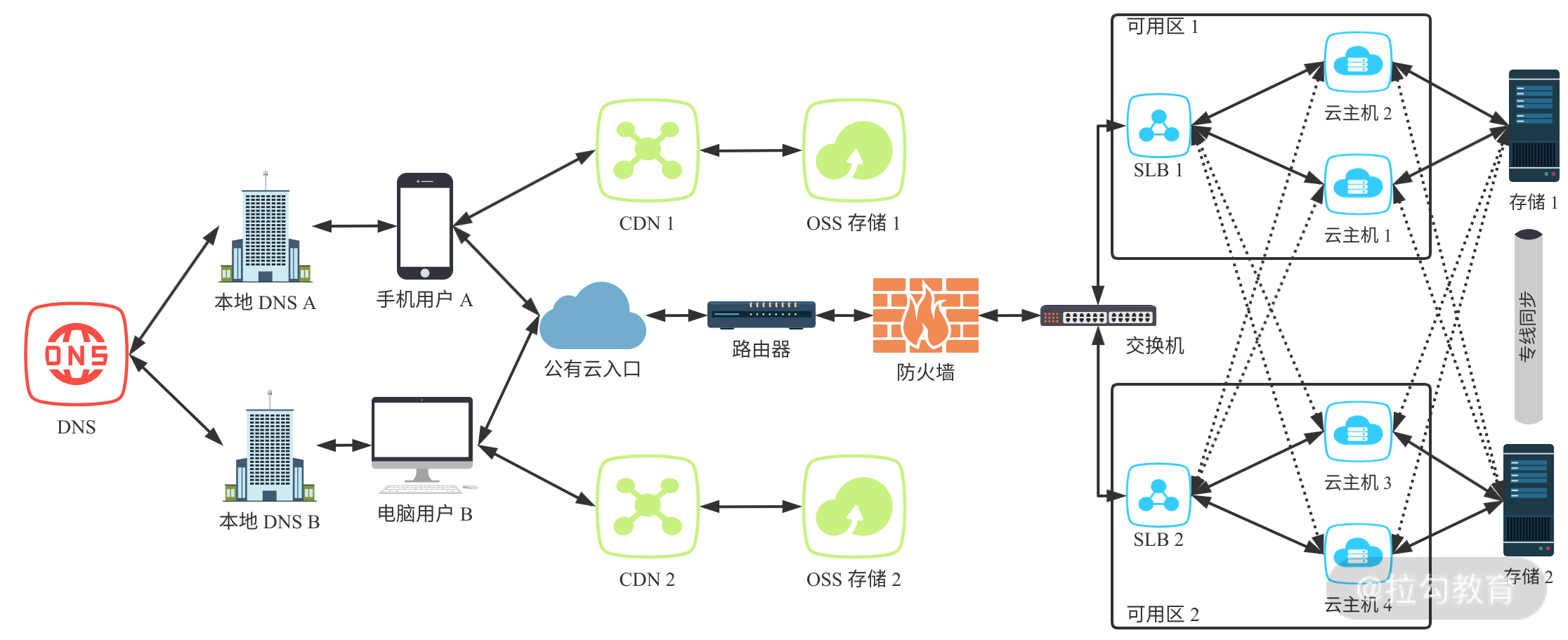 从这个云架构拓扑图的组成部分我们就知道,存储系统、业务系统、SLB 和 DNS 非常重要。