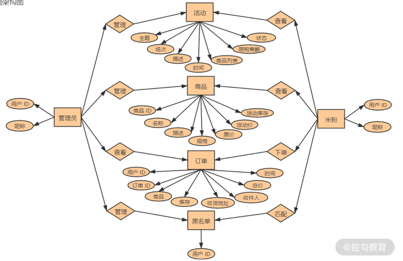 这些数据中,活动信息、商品信息、黑名单都是由管理员在管理后台管理的,只有订单信息是由用户在商城下单创建的,管理员可以通过管理后台查看订单信息。