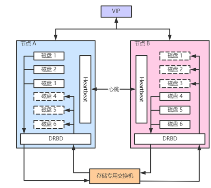 通常,NAS 存储系统中会用到一种叫 DRBD (Distributed Replicated Block Device,分布式复制块设备) 的技术。该技术能将存储节点的磁盘作为块设备,通过互相映射的方式实现互相备份。如下图所示: