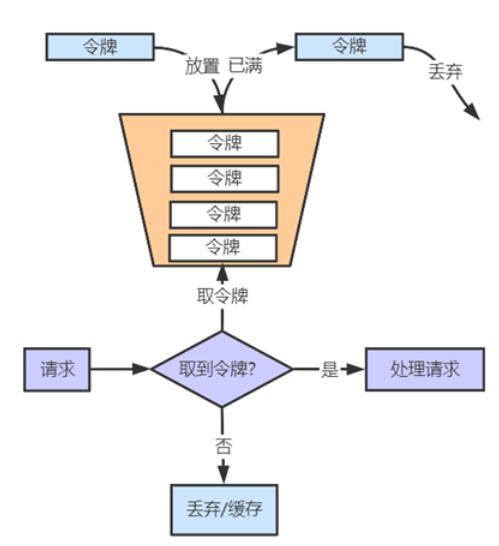 令牌桶算法的基本原理是,使用一个定时器以恒定速度往桶里颁发令牌,桶满了则丢弃多余令牌。请看示意图: