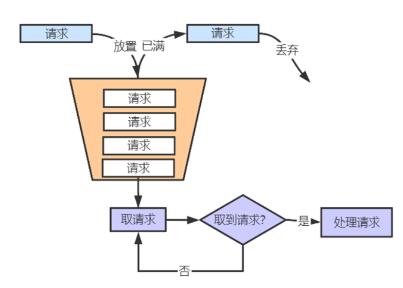 漏桶算法的原理跟令牌桶有点相似,只不过漏桶算法采用“生产者-消费者”模型。在“生产者”一端,所有请求进队列,队列满了则丢弃请求。在“消费者”一端,以恒定速度消费队列并处理请求。
