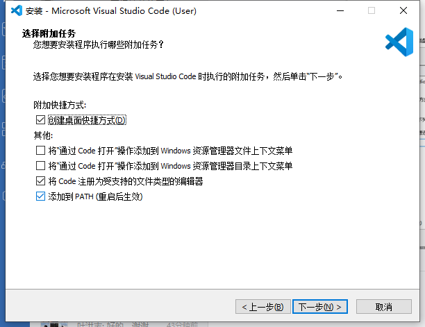 有一步选择附加任务中,我建议全都下面五项勾上。(如果勾选了“添加到PATH”,则安装完需要重启一下电脑)