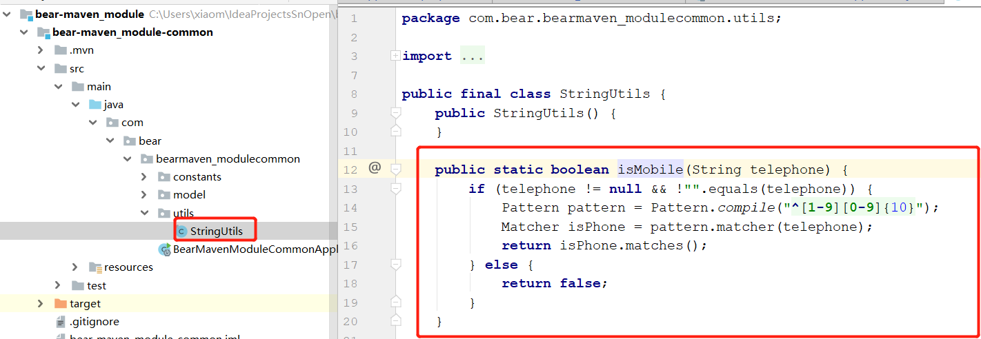 1. 在bear-maven_module-common子项目中添加一个StringUtils类,该类的作用是验证字符串是否是手机号,如果是,返回true