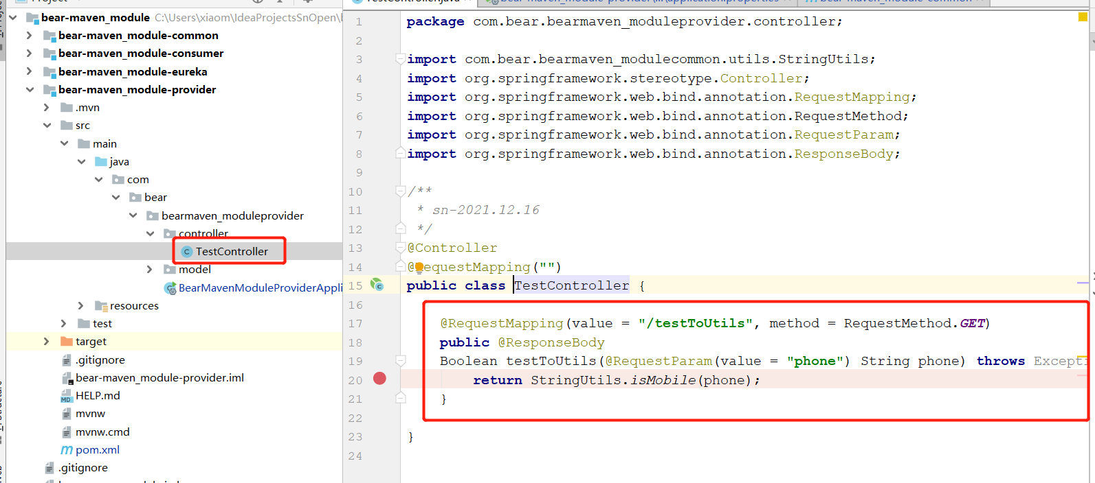 3. 启动bear-maven_module-provider子项目,在浏览器调用bear-maven_module-provider子项目中的/testToUtils接口,查看返回结果