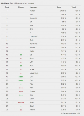 从PYPL来看,Python以遥遥领先的姿态占据榜首,相比于已经市场饱和,热度已经下降的Java,Python可以说是如日中天。