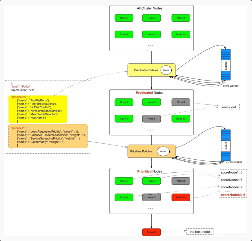 - 第二阶段:优选过程,节点优先级打分,对第一步筛选出的符合要求的主机进行打分,在主机打分阶段,调度器会考虑一些整体优化策略,比如把容一个Replication Controller的副本分布到不同的主机上,使用最低负载的主机等。