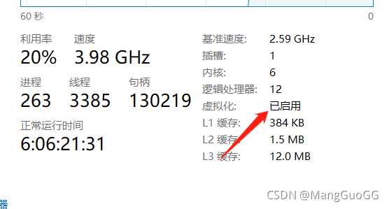 3.开启虚拟化重启后,进入任务管理器看虚拟化是否已启用。