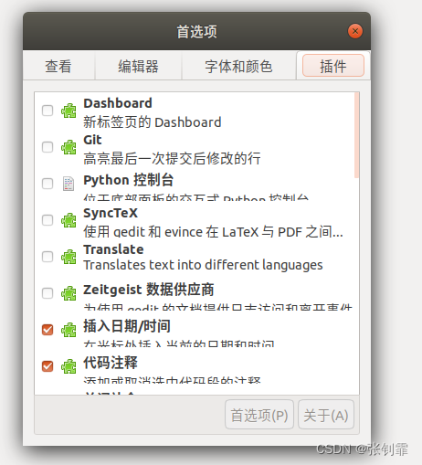 随意使用gedit打开一个文本/代码,然后将页面放到最大,单击左上角的文本编辑器,选择“首选项”,在里面勾选需要使用的插件。
