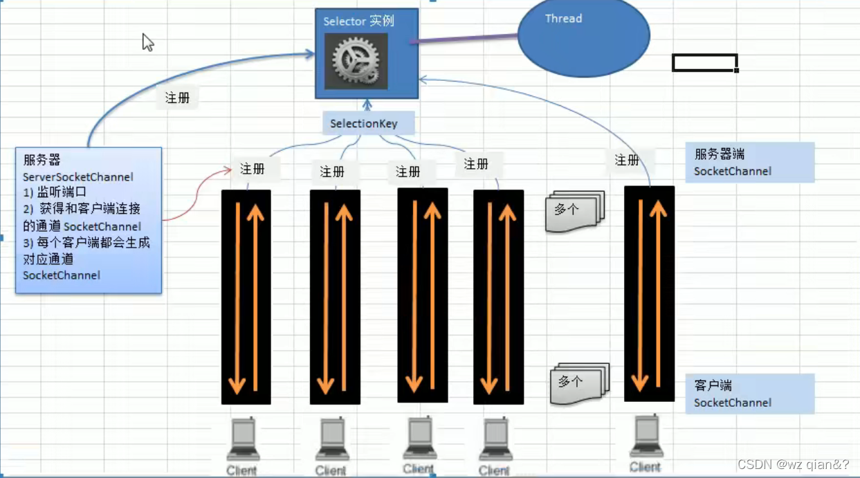 Selector(选择器)用于监听多个通道的事件,(比如:连接请求、数据到达等),因此使用单个线程就可以监听多个客户端通道。