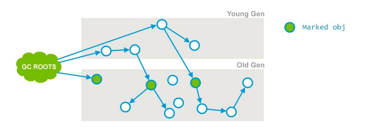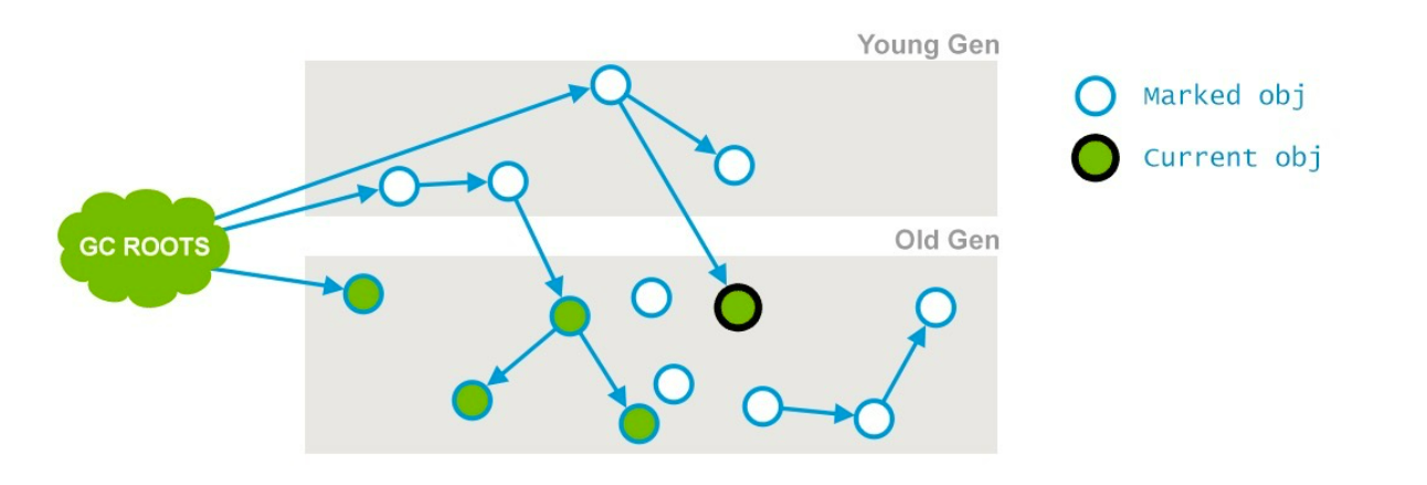 Concurrent Mark(阶段2) :并发标记。会从找到的GC Root开始,找到老年代中存活的对象。并不是老年代中所有存活的对象都会被标记,必须得从GC root出发的才能被标记。不会stop the world。