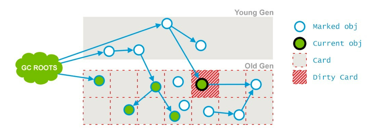 这个阶段又是一个并发阶段,和应用线程并行运行,不会中断他们。前一个阶段在并行运行的时候,一些对象的引用已经发生了变化,当这些引用发生变化的时候,JVM会标记堆的这个区域为Dirty Card(包含被标记但是改变了的对象,被认为"dirty"),这就是 Card Marking。那些能够从dirty card对象到达的对象也会被标记,这个标记做完之后,dirty card标记就会被清除了。