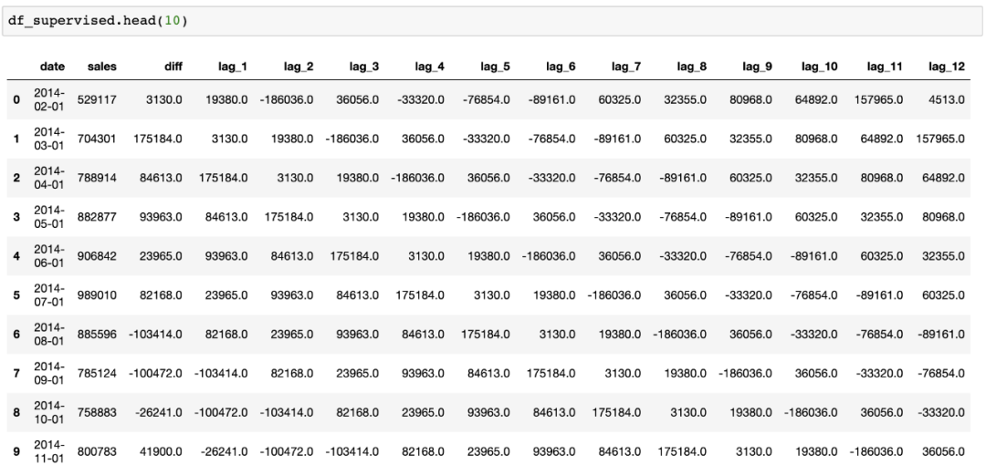 #create dataframe for transformation from time series to superviseddf_supervised = df_diff.drop(['prev_sales'],axis=1)#adding lagsfor inc in range(1,13):field_name = 'lag_' + str(inc)df_supervised[field_name] = df_supervised['diff'].shift(inc)#drop null valuesdf_supervised = df_supervised.dropna().reset_index(drop=True)