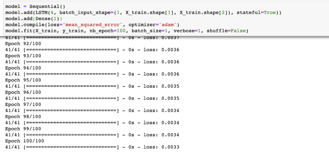 model = Sequential()model.add(LSTM(4, batch_input_shape=(1, X_train.shape[1], X_train.shape[2]), stateful=True))model.add(Dense(1))model.compile(loss='mean_squared_error', optimizer='adam')model.fit(X_train, y_train, nb_epoch=100, batch_size=1, verbose=1, shuffle=False)