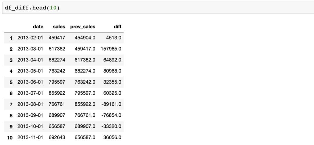 #create a new dataframe to model the differencedf_diff = df_sales.copy()#add previous sales to the next rowdf_diff['prev_sales'] = df_diff['sales'].shift(1)#drop the null values and calculate the differencedf_diff = df_diff.dropna()df_diff['diff'] = (df_diff['sales'] - df_diff['prev_sales'])df_diff.head(10)