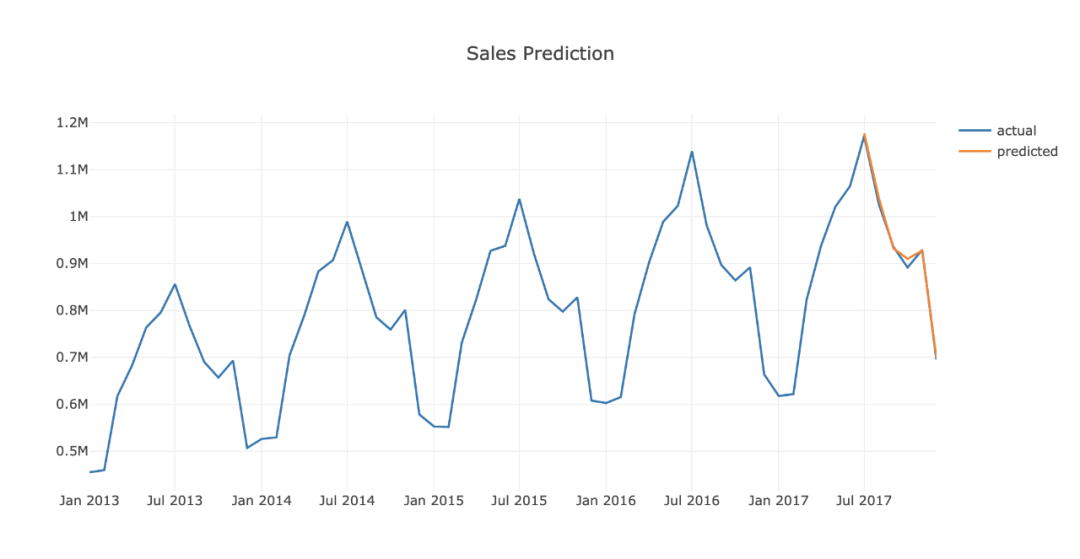 #merge with actual sales dataframedf_sales_pred = pd.merge(df_sales,df_result,on='date',how='left')#plot actual and predictedplot_data = [go.Scatter(x=df_sales_pred['date'],y=df_sales_pred['sales'],name='actual'),go.Scatter(x=df_sales_pred['date'],y=df_sales_pred['pred_value'],name='predicted')]plot_layout = go.Layout(title='Sales Prediction')fig = go.Figure(data=plot_data, layout=plot_layout)pyoff.iplot(fig)