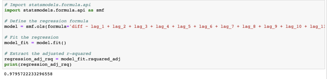 # Import statsmodels.formula.apiimport statsmodels.formula.api as smf# Define the regression formulamodel = smf.ols(formula='diff ~ lag_1', data=df_supervised)# Fit the regressionmodel_fit = model.fit()# Extract the adjusted r-squaredregression_adj_rsq = model_fit.rsquared_adjprint(regression_adj_rsq)