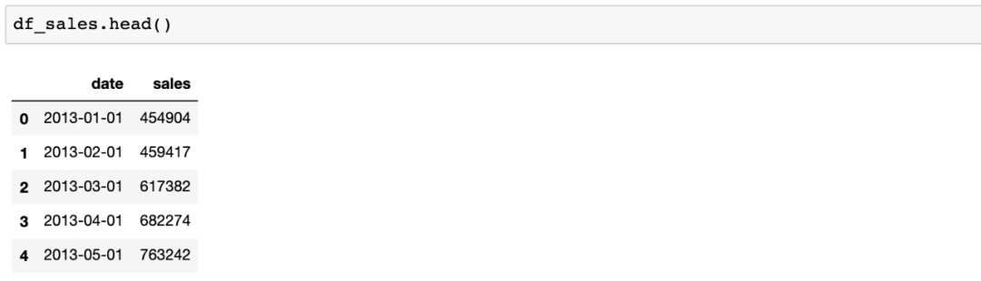 #represent month in date field as its first daydf_sales['date'] = df_sales['date'].dt.year.astype('str') + '-' + df_sales['date'].dt.month.astype('str') + '-01'df_sales['date'] = pd.to_datetime(df_sales['date'])#groupby date and sum the salesdf_sales = df_sales.groupby('date').sales.sum().reset_index()